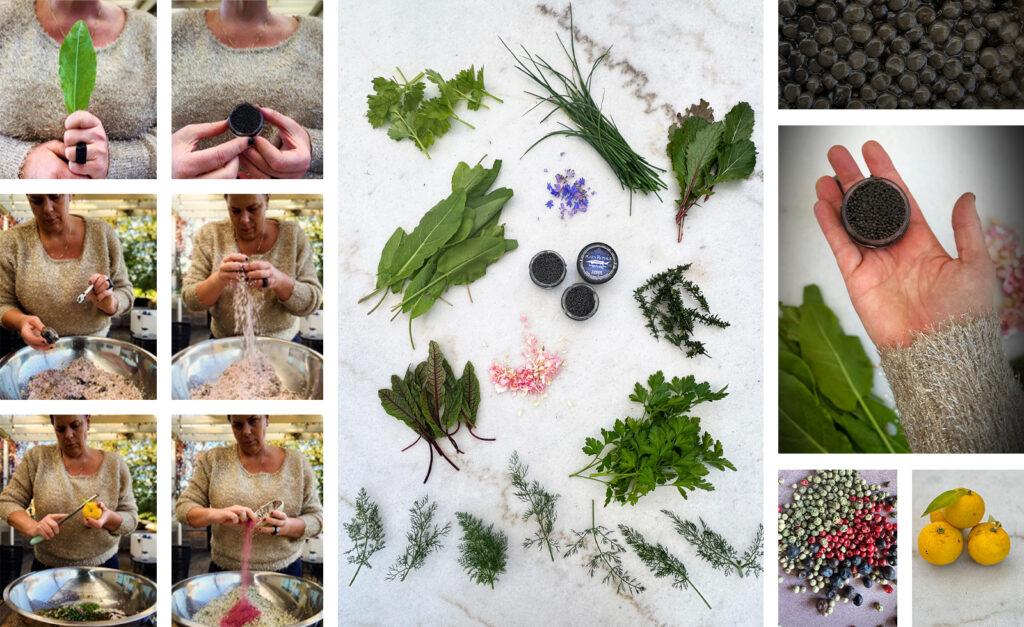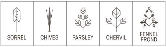 Fresh Herbs: Sorrel, Chives, Parsley, Savory, Chervil, Anise Hyssop, Fennel Fronds, Pink Dianthus Petals, Borage Flowers Produce: Turnip Greens,Celery Leaf, Cucumber Peels Spices: Green Peppercorn, Pink Peppercorn,White Peppercorn, Juniper, Fennel Seed,Sumac Zest: Lemon& Yuzu Zest Other: California White Sturgeon Caviar,House Made BeetPowder, Red Dulse Flakes,Maldon Salt