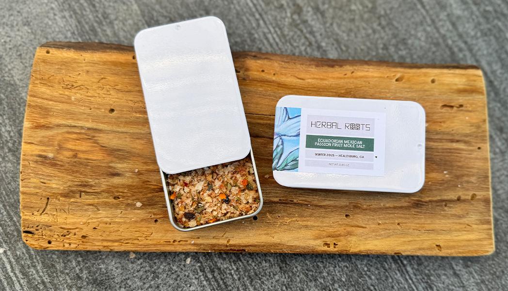 A modern, traditional herb salt with one foot on each side of the equator. One foot shaped by a stretch of shoreline near Montañita, Ecuador — where passion fruit falls from the sky and surf culture salts everything. A hearty herb funfetti of bay leaves, sage, rosemary, thyme is peppered with pie-spice like cinnamon basil blooms. Passion fruit, intensely sweet and sour is an underlying sensation, coupled with fruity pineapple sage this screams tropical Latin America winter fun. Exacerbated by the other foot planted firmly in Mexico, with a spotlight on mole and spice — Oaxaca’s seeds and alchemy. This isn’t a recipe as much as a method: herbaceous, spice-forward, built from what’s around, traded, remembered. The result is a deeply Indigenous and ultra-creative crumble of sweet and sour pressed against herbal saline. Fruit, herb and floral set against chili’s fire. Cinnamon and avocado leaves bring wormwood-like rough greenery. Mezcal-soaked citrus zest lends smoke and brightness — honoring Indigenous ingenuity and a political drinking adventure had in Guerrero. This moves the way culture does: layered, adaptive, unresolved, fully in motion — it feels like ceremony. It holds complexity like mole and should be used as such. It also wants to remind that when brilliant things fall from the sky, you use them — like this salt’s namesake recipe, Passion Fruit Pork Mole. Use this where richness matters (simply): pork chops and belly, carnitas, tamales, butternut squash tacos, roasted cauliflower. Roast chicken or carrots. Carrot mole. Stewed white beans.