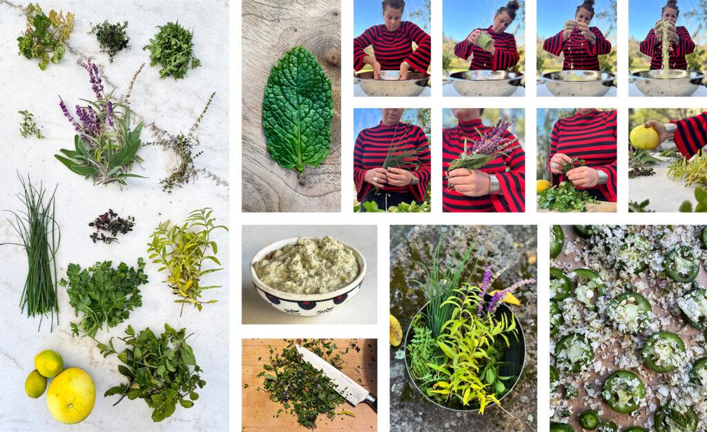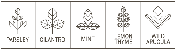 Fresh Herbs: Parsley, Cilantro, Mint, Lemon Thyme, Wild Arugula, Chives, Lemon Verbena, Syrian Oregano, Sage Produce: Serrano Chilies, Lemon Spices: Coriander, Green, Red, White & Black Peppercorn, Cardamon, Cummin Seed, Sumac, Nigella Seed, Turmeric, Nigella Seeds, Fennel Seeds, Granulated Onion & Garlic, Wild Hing Zest: Lemon & Grapefruit Zest Other: House Made Green Chili (Serrano) Tahini,Maldon Salt