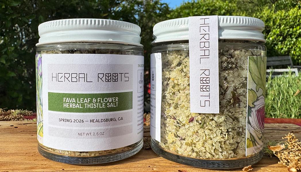 This is like a pinch of spring herbal dopamine delivering ultimate satisfaction with its fava-dominant essence. Lemon-soaked fava beans are blended into a wild arugula pesto and cured into the salt base —spring herbs are then jam-packed in. Spearmint leads with cool bright intensity, Moroccan mint layers in softer sweetness, and hyssop adds an earthy camphor lift. Lemon thyme blends earthy citrus, parsley and chives keep it verdant and sharp, and red-veined sorrel flicks in a tart citric edge. Ample fava and artichoke leaves bring sweet, nutty, earthy green vivaciousness with a little bitter balance. Fennel fronds, celery leaf and Syrian oregano keep it grounded and clean. Green garlic and green onion give extra savory strength, rounded out by a peppery onion-esque spice mix piquant with white pepper and dried shallots. Bits and particles of fresh, earthy, nutty cardoon are strewn throughout the surging extravaganza. Chive blossoms add a final allium texture, as do the dried purple shallots, to this gritty thistle salt. Use for marinating herbalized baby artichokes, in a spring chicken shawarma, or fava leaf risotto.