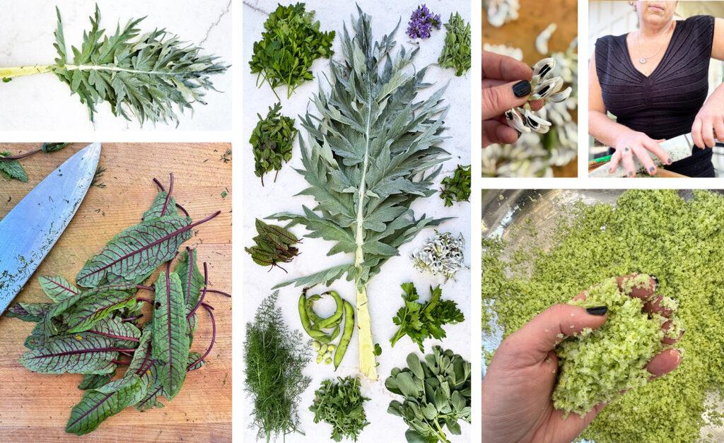 Fresh Herbs: Spearmint, Chives, Chive Blossoms, Parsley, Wild Arugula, Lemon Thyme, Moroccan Mint, Hyssop, Wild Arugula, Red Veined Sorrel, Fennel Fronds, Syrian Oregano, Celery Leaf, Wild Mustard Flowers Produce: Fava Beans, Flowers and Leaves, Cardoon, Artichoke Leaf, Green Garlic, Green Onion Spices: Purple Striped Garlic, Dried Shallots, Toasted Onion Powder, White Pepper Citrus Zest: Lemon Zest Other: Maldon Salt