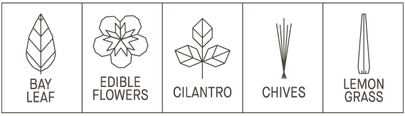 Fresh Herbs: Cilantro, Chives, Bay Leaves, Garlic Chives, Fennel Fronds, Parsley, Lemon Grass, Thai Basil, Coriander Flowers, Red Veined Sorrel, Savory, Wild Arugula, Calendula, Pineapple Sage Produce: Ginger, Turnip & Mustard Greens, Red Chili, Leeks, Sprouting Broccoli Spices: Star Anise, Cloves, Cinnamon, Fennel, Sichuan & Long Peppercorn, Curry Leaves, Garlic Zest: Tangerine Zest Other: Hoisin Sauce, Mushroom Powder, Maldon Salt