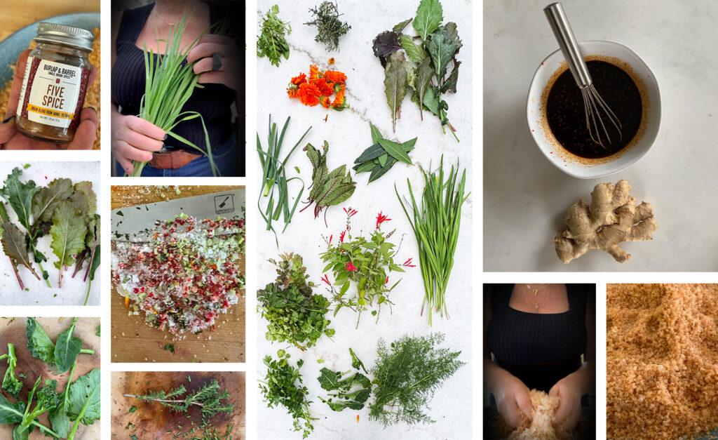 Fresh Herbs: Cilantro, Chives, Bay Leaves, Garlic Chives, Fennel Fronds, Parsley, Lemon Grass, Thai Basil, Coriander Flowers, Red Veined Sorrel, Savory, Wild Arugula, Calendula, Pineapple Sage Produce: Ginger, Turnip & Mustard Greens, Red Chili, Leeks, Sprouting Broccoli Spices: Star Anise, Cloves, Cinnamon, Fennel, Sichuan & Long Peppercorn, Curry Leaves, Garlic Zest: Tangerine Zest Other: Hoisin Sauce, Mushroom Powder, Maldon Salt