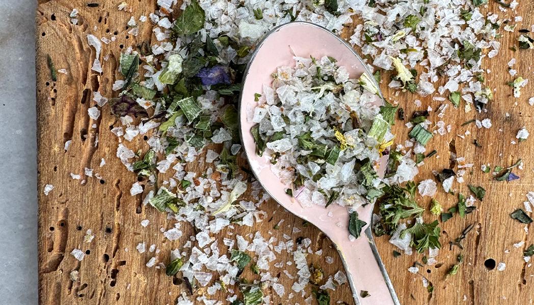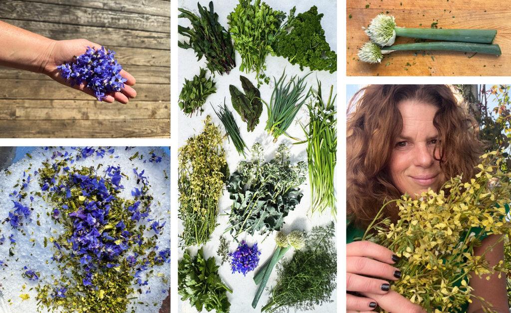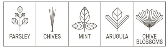 Fresh Herbs:  Parsley, Chives, Spearmint, Wild Arugula Flowers, Chive Blossoms, Red Veined Sorrel, Borage Flowers, Lemon Thyme, Fennel Fronds, Red Dandelion, Celery Leaf  Produce:  Green Garlic, Onion Flowers, Garlic Flowers, Broccoli Greens, Wild Onions  Spices:  Purple Striped Garlic, Toasted Onion Powder, Dried Shallots, Fermented White Peppercorn, Toasted Onion Flakes  Citrus Zest:  Lemon Zest  Other:  Maldon Salt