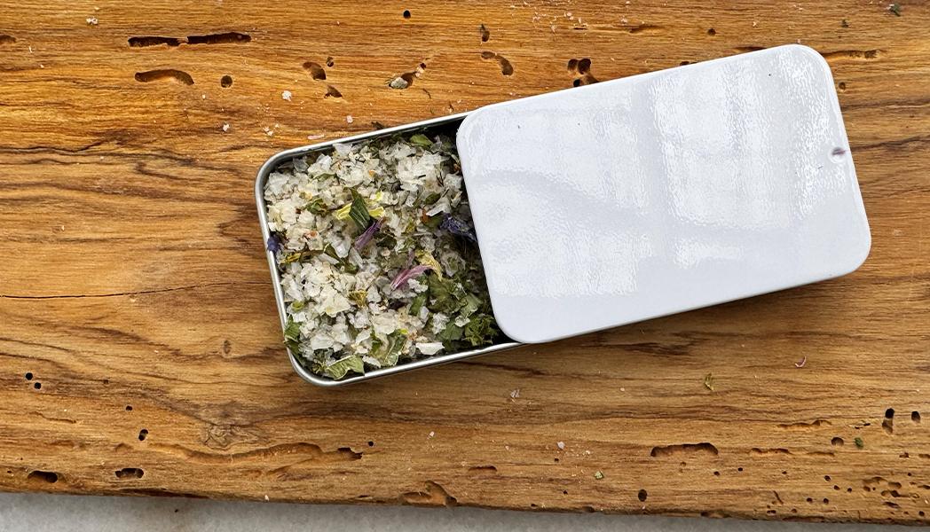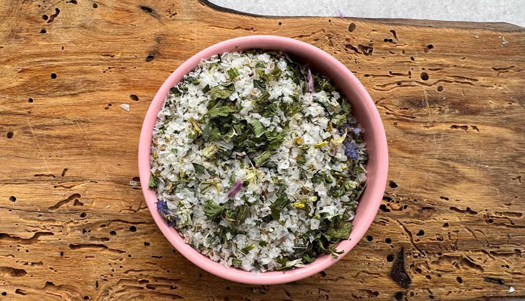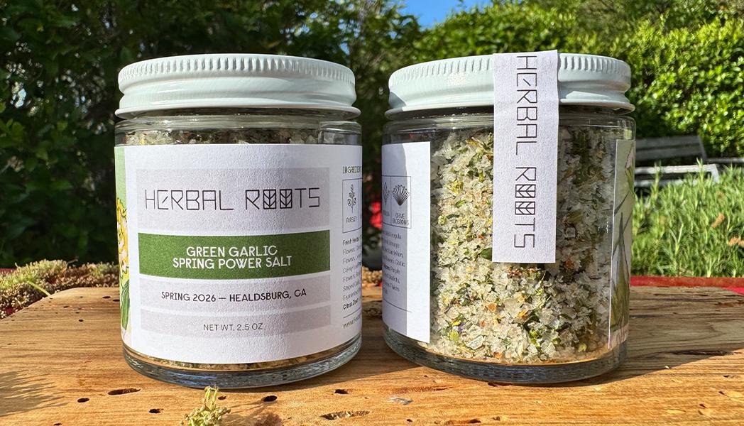 https://shop.herbal-roots.com/product/the-righteous-emergence-collection/This salt reflects the potent energy of green garlic, the first powerful act of spring. Bursting with bright, sharp, fresh allium heat — this is full potent garlic without any aggressive force. A softening emerges with excessive amounts of complimentary clean grassy parsley. Spearmint accentuates a super fresh feel and adds electricity. Moroccan mint tempers with a sweet-cool finish. Tender chives, and loads of fluffy chive blooms contribute a delicate wild onion essence with significant textural allure with thicker-than-usual cut chive ringlets. Red dandelion and arugula flowers edge toward a slight peppery bitterness. Celery leaf re-cleans, and fennel fronds and borage flowers thread a quiet cucumber anise beauty, that laces with a more demure power. This is garlicky, but isn’t overpowering and pushy, its clean and green and gardenlike. It’s the epitome of power and totally anti force.  Use it with spring goat and lamb milk cheeses, in the broth of a spring ossobuco, or the lemony gremolata on top, perfect as an Easter lamb shank tenderizer seasoning, or in a spring greens goddess dressing. It makes deviled eggs punchy fancy.