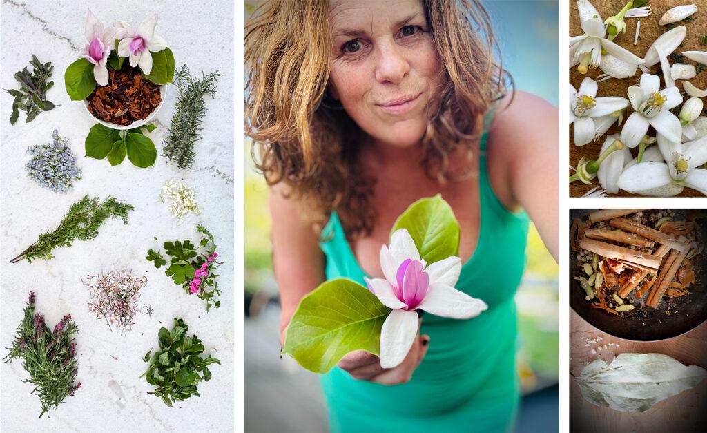 Fresh Herbs: Lavender, Pink Dianthus, Purple Sage, Strawberry Geranium, Pineapple Sage, Moroccan Mint, Wild Violets, Tarragon, Rosemary Produce: Ginger, Strawberries, Rhubarb, Citrus & Peach Blossoms Spices: Vanilla, Cinnamon Green & Black Cardamon, All Spice, Mace, Black & White Peppercorn, Litsea Berries, Pollen Citrus Zest: Lemon and Orange Zest Other: Magnolia Flowers, Maldon Salt, Pearl Sugar