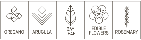 Fresh Herbs: Syrian Oregano, Fennel Fronds, Rosemary, Bay Leaves, Lemon & Lavender Thyme, Purple & Green Sage, Parsley,Marjoram, Basil, Mint, Myrtle, Caper Leaves, Borage Flowers, Wild Arugula, Purslane Produce: Chicory,Celery Leaves Spices: Fennel Seed, Calabrian Chili Flakes, Garlic Granules Zest: Lemon & GrapefruitZest Other: Capers, Squid Ink, House Made Quail & Condor Sourdough Breadcrumbs, Maldon Salt