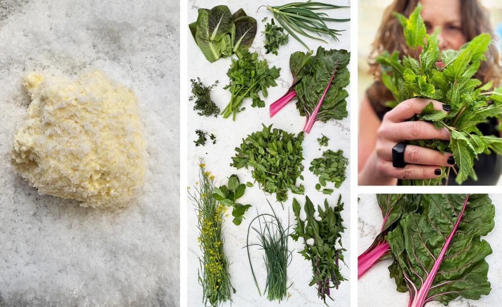 Fresh Herbs: Spearmint, Moroccan Mint, Orange Mint, Peppermint, Anise Hyssop, Syrian Oregano, Lemon Thyme, Celery Leaf, Wild Mustard Flowers, Chives, Chive Blossoms, Green Garlic, Wild Arugula Produce: Red Chili, Bitter Radicchio, Swiss Chard Spices: House Dried Calabrian Chili Flakes, Bee Pollen, Fermented White Pepper, Sumac, Fennel Seed Citrus Zest: Lemon Zest Other: Bellwether Ricotta, Maldon Salt